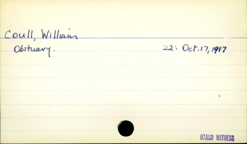 Dunedin Public Libraries (4th Jun 2019). Coull, William. In Website Dunedin Public Libraries. Retrieved 4th Apr 2026 04:44, from https://dunedin.recollect.co.nz/nodes/view/31049