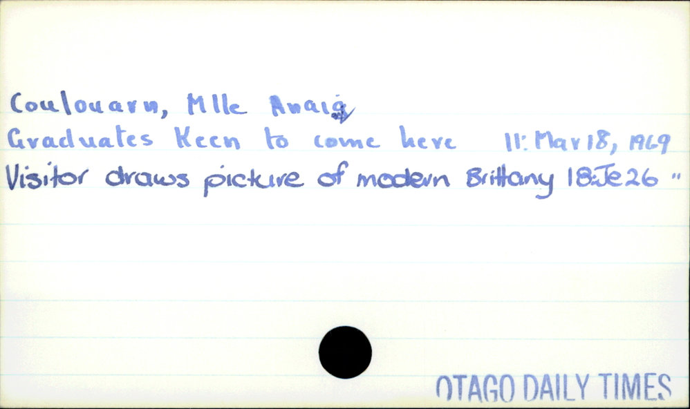 Dunedin Public Libraries (12th Jun 2019). Coulouarn, Anaig (Miss). In Website Dunedin Public Libraries. Retrieved 4th Apr 2026 04:44, from https://dunedin.recollect.co.nz/nodes/view/31051