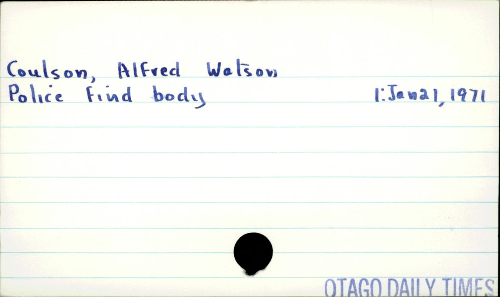 Dunedin Public Libraries (4th Jun 2019). Coulson, Alfred Watson. In Website Dunedin Public Libraries. Retrieved 4th Apr 2026 04:49, from https://dunedin.recollect.co.nz/nodes/view/31052