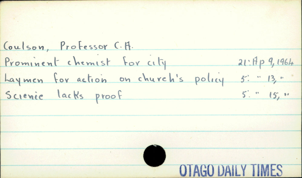 Dunedin Public Libraries (4th Jun 2019). Coulson, Professor C A. In Website Dunedin Public Libraries. Retrieved 4th Apr 2026 04:44, from https://dunedin.recollect.co.nz/nodes/view/31054