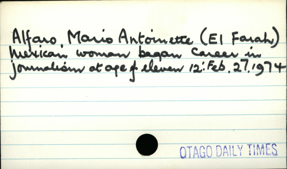 Dunedin Public Libraries (26th Jun 2018). Alfaro, Mario Antoinette (El Farah). In Website Dunedin Public Libraries. Retrieved 9th Apr 2026 13:42, from https://dunedin.recollect.co.nz/nodes/view/3385