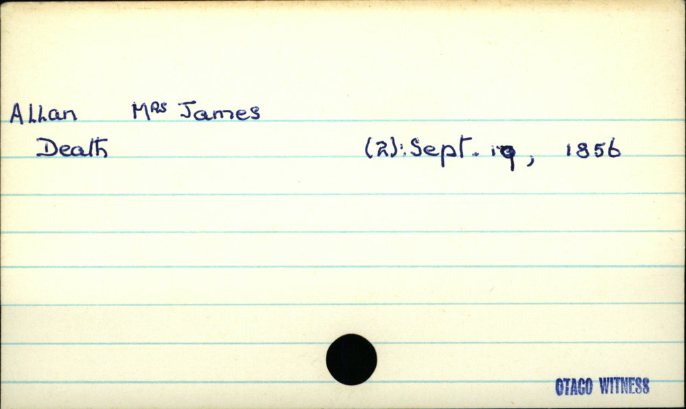 Dunedin Public Libraries (5th Jun 2018). Allan, James (Mrs). In Website Dunedin Public Libraries. Retrieved 27th Mar 2026 14:15, from https://dunedin.recollect.co.nz/nodes/view/3591
