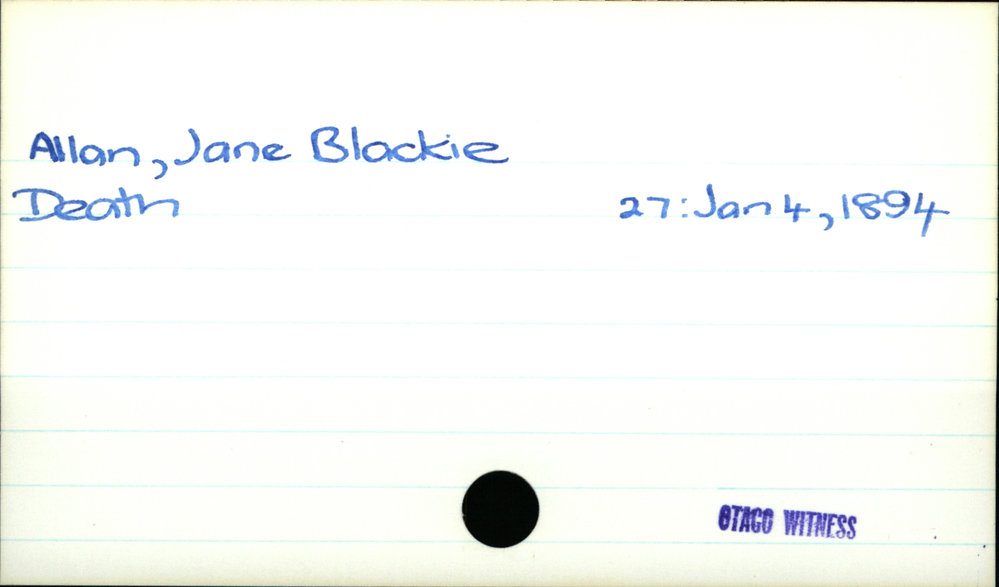Dunedin Public Libraries (18th Jun 2018). Allan, Jane Blackie . In Website Dunedin Public Libraries. Retrieved 27th Mar 2026 14:15, from https://dunedin.recollect.co.nz/nodes/view/3595