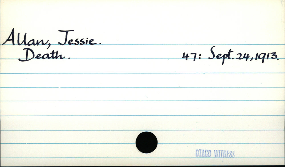 Dunedin Public Libraries (17th Jun 2018). Allan, Jessie. In Website Dunedin Public Libraries. Retrieved 27th Mar 2026 14:15, from https://dunedin.recollect.co.nz/nodes/view/3600