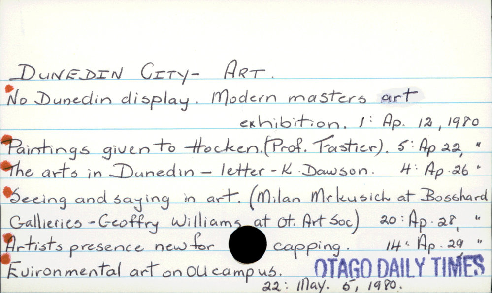 Dunedin Public Libraries (21st Jun 2016). Dunedin City - Art. In Website Dunedin Public Libraries. Retrieved 1st May 2026 03:42, from https://dunedin.recollect.co.nz/nodes/view/36676