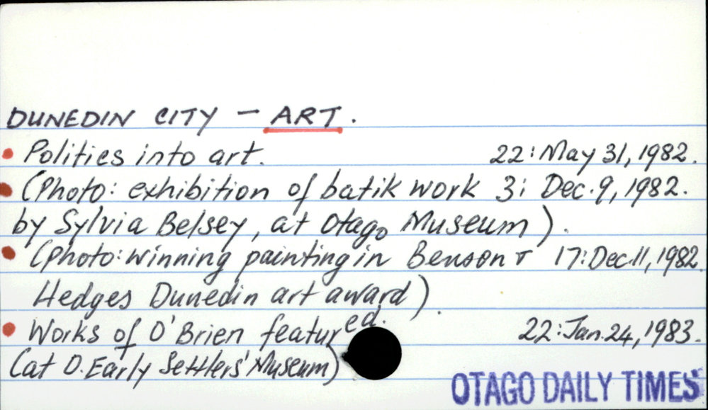Dunedin Public Libraries (21st Jun 2016). Dunedin City - Art. In Website Dunedin Public Libraries. Retrieved 1st May 2026 03:42, from https://dunedin.recollect.co.nz/nodes/view/36678