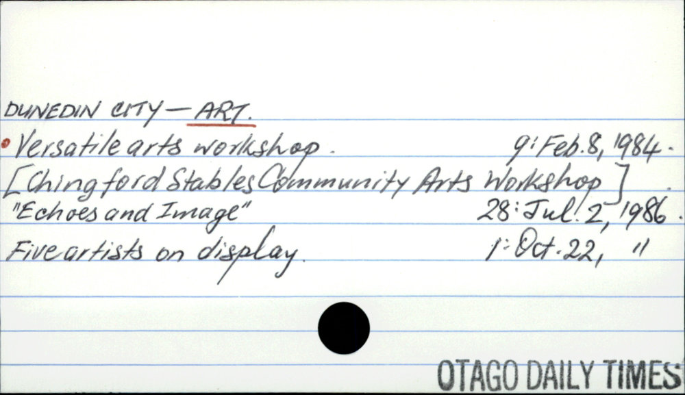 Dunedin Public Libraries (22nd Jun 2016). Dunedin City - Art. In Website Dunedin Public Libraries. Retrieved 1st May 2026 03:42, from https://dunedin.recollect.co.nz/nodes/view/36680