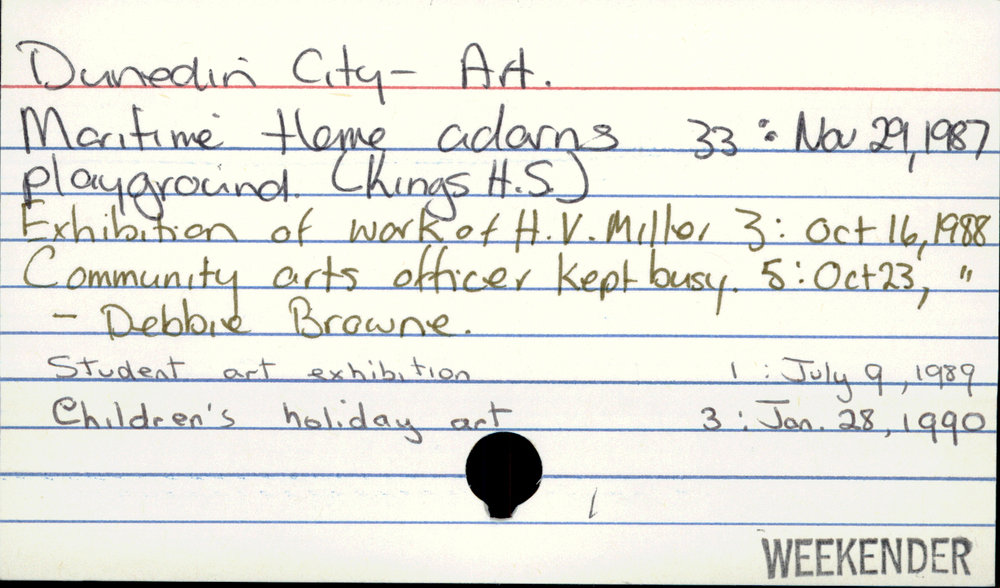 Dunedin Public Libraries (22nd Jun 2016). Dunedin City - Art.. In Website Dunedin Public Libraries. Retrieved 1st May 2026 03:45, from https://dunedin.recollect.co.nz/nodes/view/36691