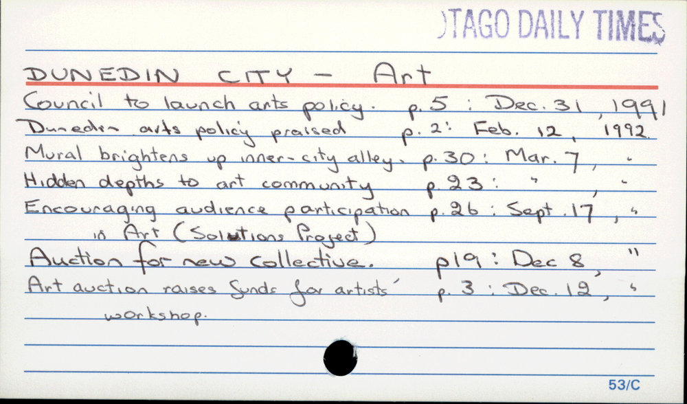 Dunedin Public Libraries (22nd Jun 2016). Dunedin City - Art. In Website Dunedin Public Libraries. Retrieved 1st May 2026 03:42, from https://dunedin.recollect.co.nz/nodes/view/36696