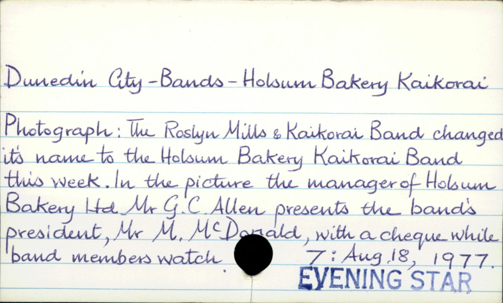 Dunedin Public Libraries (3rd Aug 2016). Dunedin City - Bands - Holsum Bakery Kaikorai. In Website Dunedin Public Libraries. Retrieved 6th Apr 2026 03:00, from https://dunedin.recollect.co.nz/nodes/view/37515