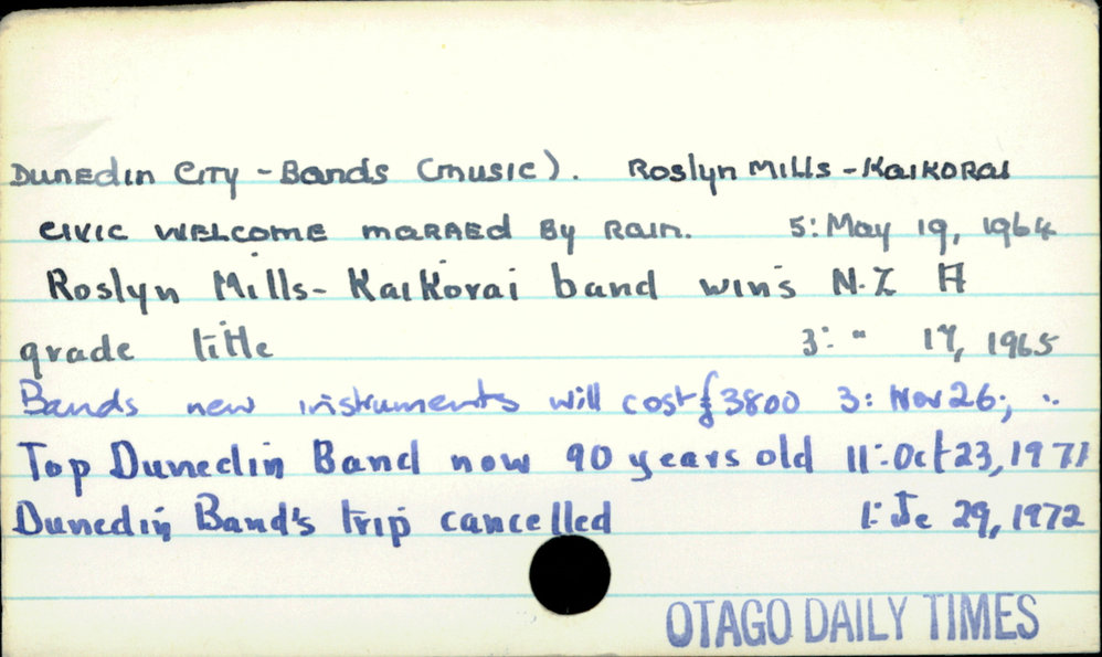 Dunedin Public Libraries (3rd Aug 2016). Dunedin City - Bands (music). Roslyn Mills-Kaikorai. In Website Dunedin Public Libraries. Retrieved 6th Apr 2026 02:53, from https://dunedin.recollect.co.nz/nodes/view/37521