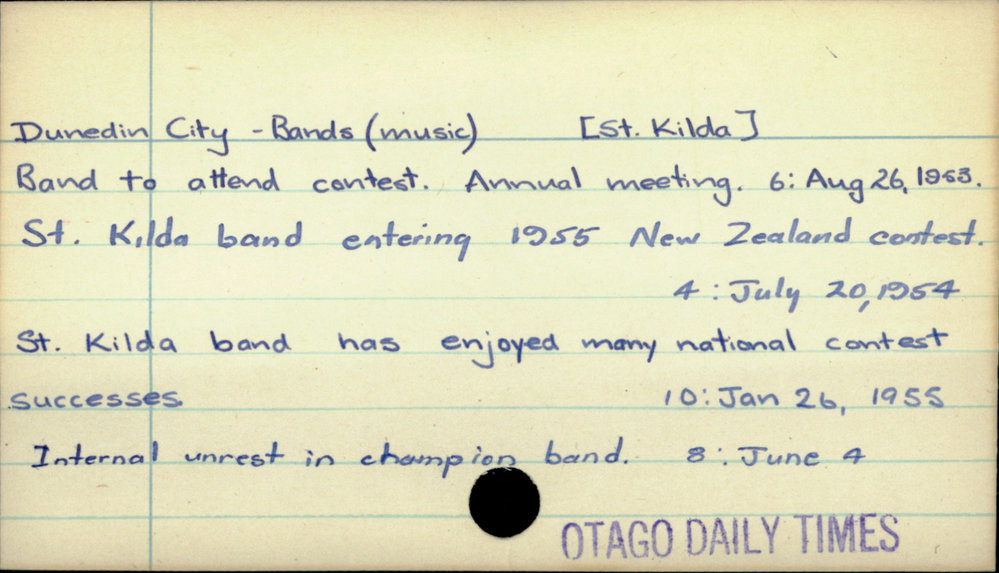 Dunedin Public Libraries (3rd Aug 2016). Dunedin City - Bands (music) [St.Kilda]. In Website Dunedin Public Libraries. Retrieved 6th Apr 2026 03:00, from https://dunedin.recollect.co.nz/nodes/view/37534