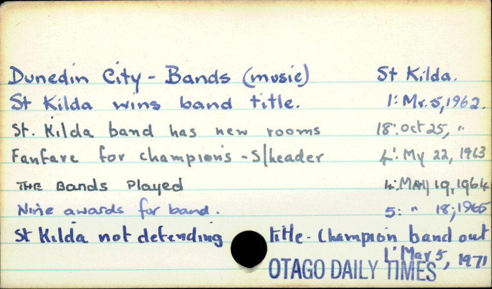 Dunedin Public Libraries (3rd Aug 2016). Dunedin City - Bands (music). In Website Dunedin Public Libraries. Retrieved 6th Apr 2026 03:02, from https://dunedin.recollect.co.nz/nodes/view/37538