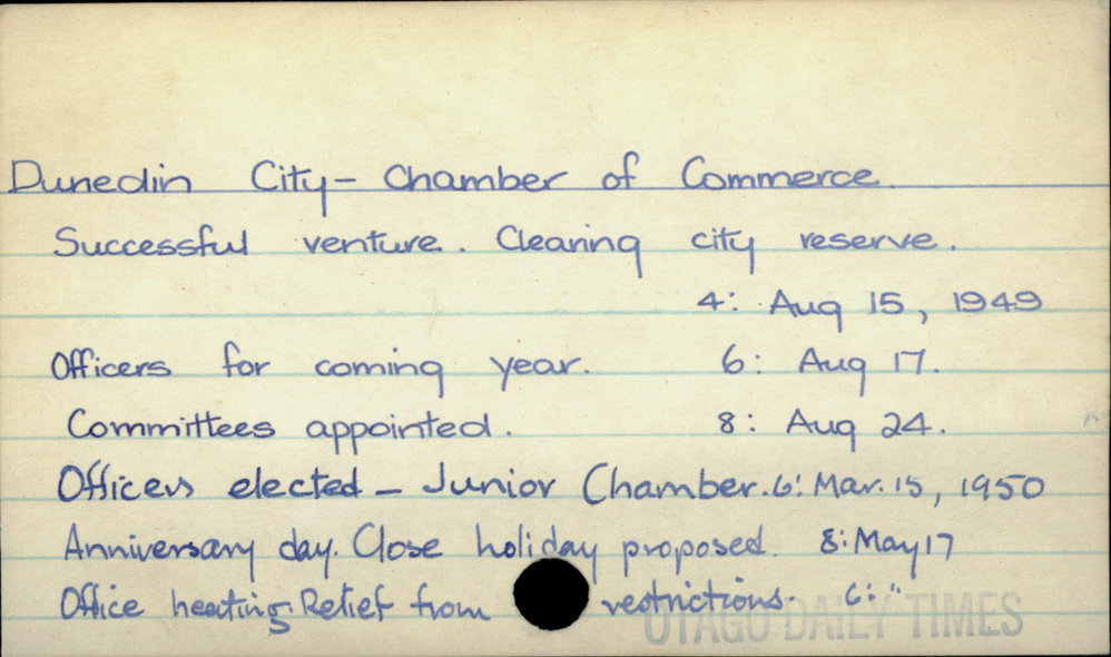 Dunedin Public Libraries (14th Oct 2016). Dunedin City - Chamber of Commerce. In Website Dunedin Public Libraries. Retrieved 2nd Apr 2026 17:45, from https://dunedin.recollect.co.nz/nodes/view/40298