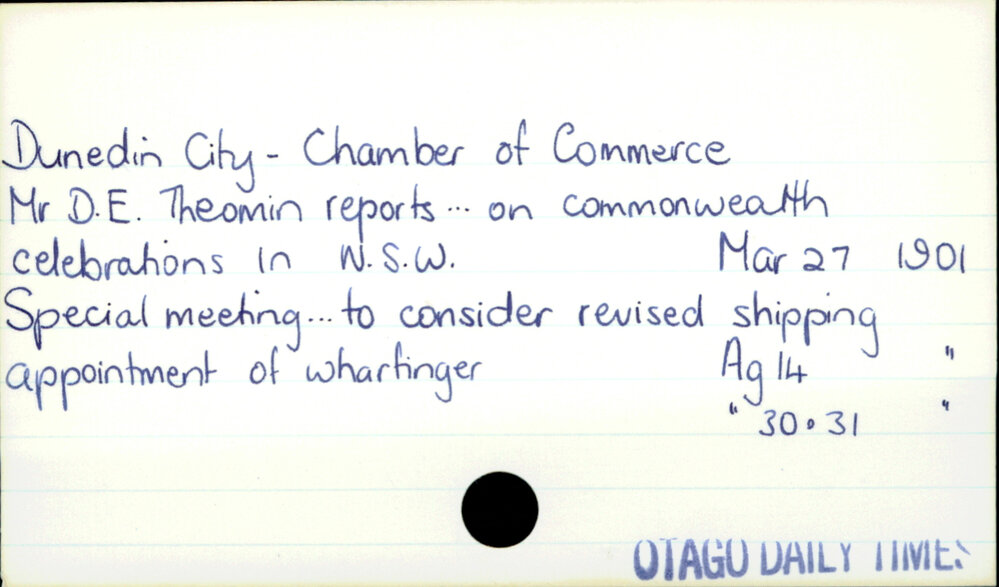 Dunedin Public Libraries (13th Oct 2016). Dunedin City - Chamber of Commerce. In Website Dunedin Public Libraries. Retrieved 2nd Apr 2026 17:56, from https://dunedin.recollect.co.nz/nodes/view/40299