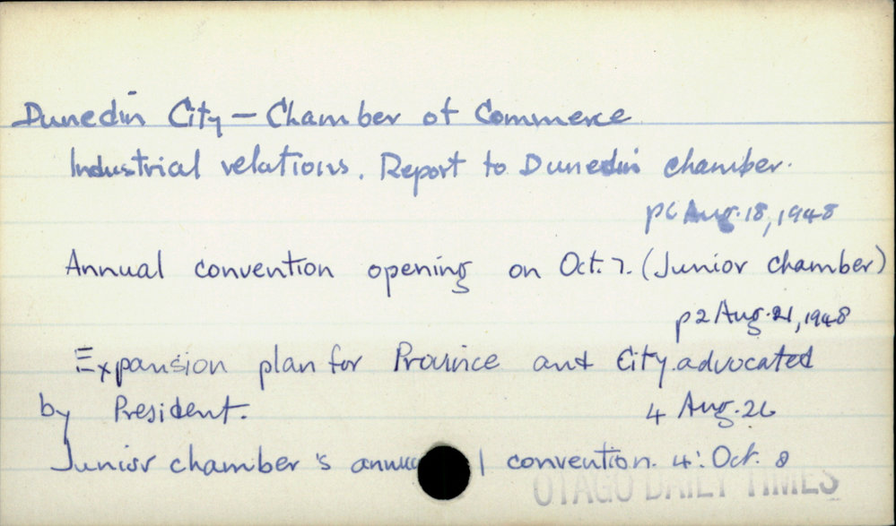 Dunedin Public Libraries (14th Oct 2016). Dunedin City - Chamber of Commerce. In Website Dunedin Public Libraries. Retrieved 2nd Apr 2026 17:56, from https://dunedin.recollect.co.nz/nodes/view/40302