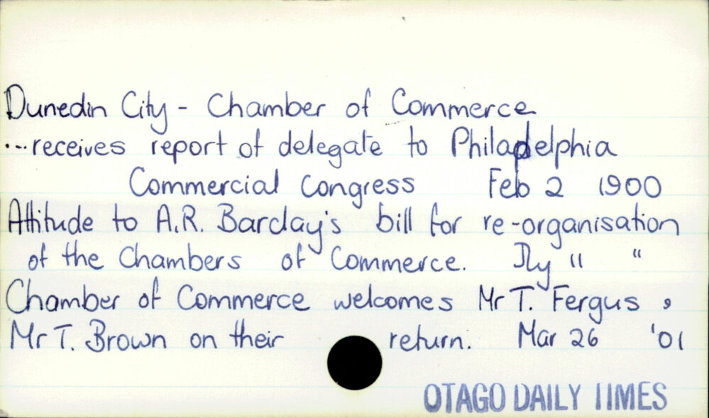 Dunedin Public Libraries (13th Oct 2016). Dunedin City - Chamber of Commerce. In Website Dunedin Public Libraries. Retrieved 2nd Apr 2026 17:45, from https://dunedin.recollect.co.nz/nodes/view/40304