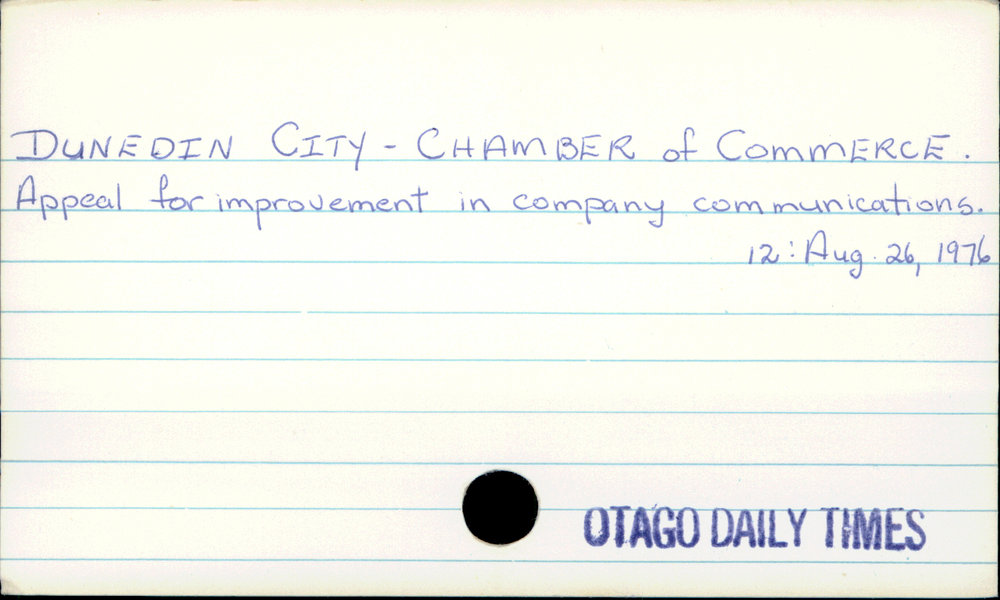 Dunedin Public Libraries (14th Oct 2016). DUNEDIN CITY - CHAMBER OF COMMERCE.. In Website Dunedin Public Libraries. Retrieved 2nd Apr 2026 17:45, from https://dunedin.recollect.co.nz/nodes/view/40305