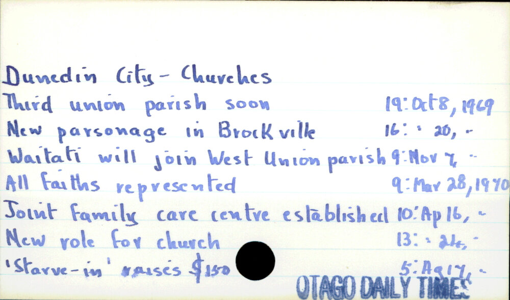 Dunedin Public Libraries (20th Oct 2016). Dunedin City - Churches. In Website Dunedin Public Libraries. Retrieved 2nd Apr 2026 21:49, from https://dunedin.recollect.co.nz/nodes/view/41149