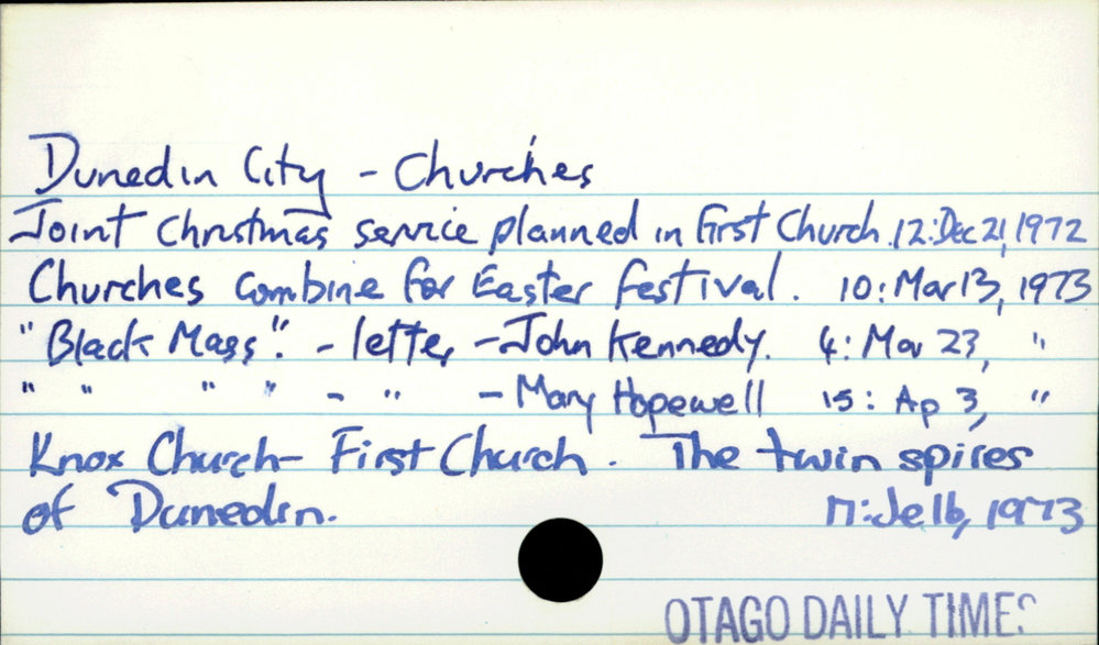 Dunedin Public Libraries (20th Oct 2016). Dunedin City - Churches. In Website Dunedin Public Libraries. Retrieved 2nd Apr 2026 21:41, from https://dunedin.recollect.co.nz/nodes/view/41153