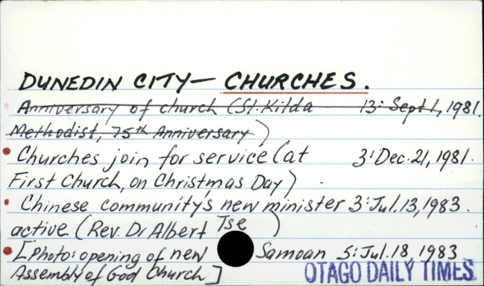 Dunedin Public Libraries (20th Oct 2016). DUNEDIN CITY - CHURCHES.. In Website Dunedin Public Libraries. Retrieved 2nd Apr 2026 21:42, from https://dunedin.recollect.co.nz/nodes/view/41160