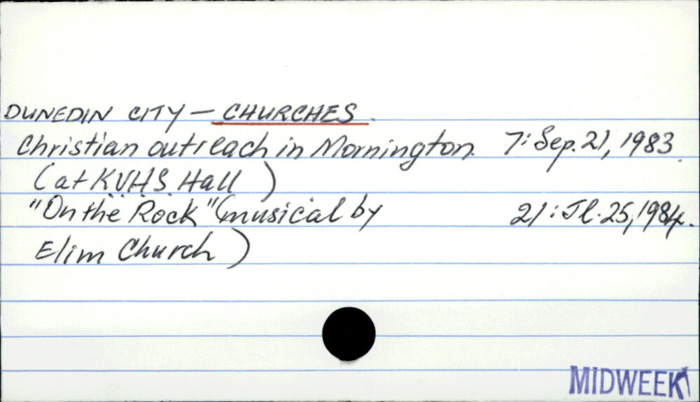 Dunedin Public Libraries (19th Oct 2016). DUNEDIN CITY - CHURCHES. In Website Dunedin Public Libraries. Retrieved 2nd Apr 2026 21:43, from https://dunedin.recollect.co.nz/nodes/view/41162
