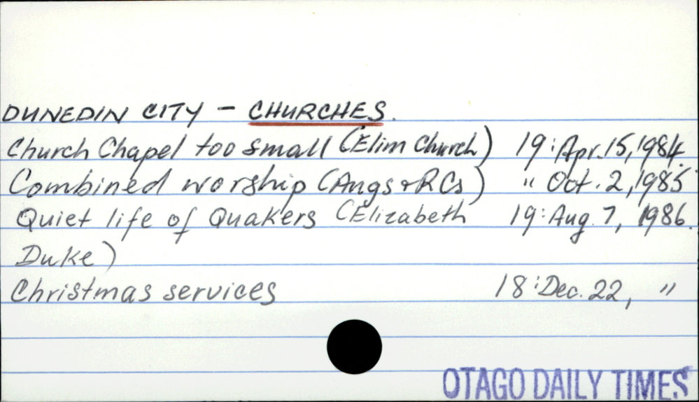 Dunedin Public Libraries (19th Oct 2016). DUNEDIN CITY - CHURCHES.. In Website Dunedin Public Libraries. Retrieved 2nd Apr 2026 21:41, from https://dunedin.recollect.co.nz/nodes/view/41163