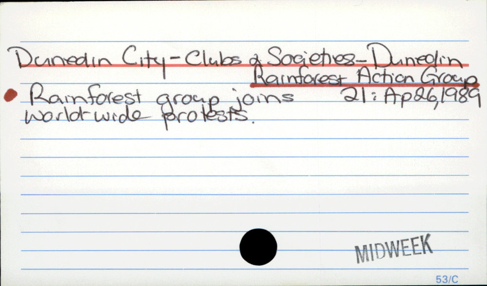 Dunedin Public Libraries (5th Nov 2016). Dunedin City - Clubs & Societies - Dunedin %Rainforest Action Group. In Website Dunedin Public Libraries. Retrieved 27th Apr 2026 17:43, from https://dunedin.recollect.co.nz/nodes/view/42019