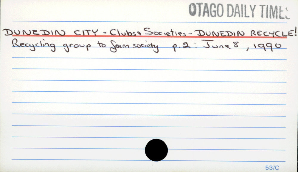 Dunedin Public Libraries (5th Nov 2016). DUNEDIN CITY - Clubs & Societies - DUNEDIN RECYCLE!. In Website Dunedin Public Libraries. Retrieved 27th Apr 2026 17:43, from https://dunedin.recollect.co.nz/nodes/view/42020
