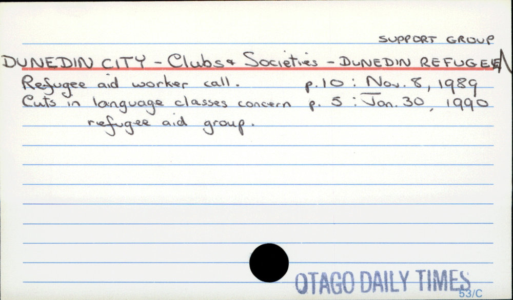 Dunedin Public Libraries (6th Nov 2016). DUNEDIN CITY - Clubs & Societies - DUNEDIN REFUGEE SUPPORT GROUP. In Website Dunedin Public Libraries. Retrieved 27th Apr 2026 17:44, from https://dunedin.recollect.co.nz/nodes/view/42023