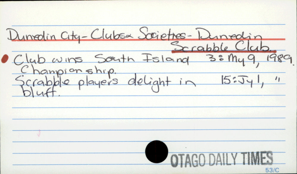 Dunedin Public Libraries (5th Nov 2016). Dunedin City - Clubs + Societies - Dunedin Scrabble Club. In Website Dunedin Public Libraries. Retrieved 27th Apr 2026 17:45, from https://dunedin.recollect.co.nz/nodes/view/42028