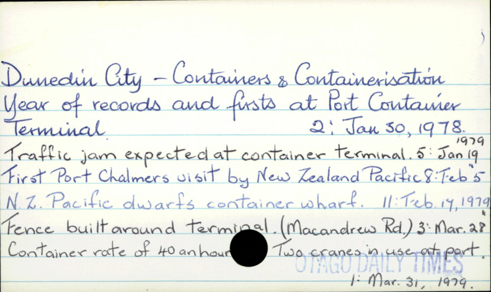 Dunedin Public Libraries (14th Nov 2016). Dunedin City - Containers & Containerisation.. In Website Dunedin Public Libraries. Retrieved 5th Apr 2026 18:21, from https://dunedin.recollect.co.nz/nodes/view/42953