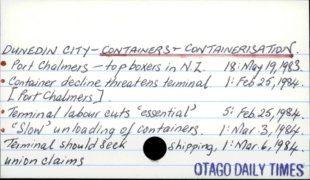 Dunedin Public Libraries (18th Nov 2016). Dunedin City - Containers & Containerisation.. In Website Dunedin Public Libraries. Retrieved 5th Apr 2026 18:21, from https://dunedin.recollect.co.nz/nodes/view/42956