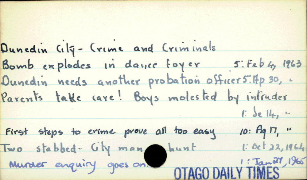Dunedin Public Libraries (19th Nov 2016). Dunedin City- Crime and Criminals. In Website Dunedin Public Libraries. Retrieved 27th Mar 2026 15:14, from https://dunedin.recollect.co.nz/nodes/view/43880