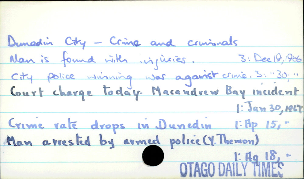 Dunedin Public Libraries (19th Nov 2016). Dunedin City - Crime and Criminals. In Website Dunedin Public Libraries. Retrieved 27th Mar 2026 15:14, from https://dunedin.recollect.co.nz/nodes/view/43885