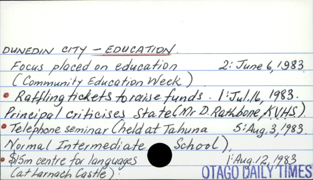 Dunedin Public Libraries (3rd Dec 2016). Dunedin City - Education. In Website Dunedin Public Libraries. Retrieved 2nd Apr 2026 10:27, from https://dunedin.recollect.co.nz/nodes/view/44801