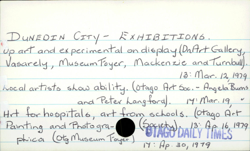 Dunedin Public Libraries (13th Dec 2016). Dunedin City - Exhibitions. In Website Dunedin Public Libraries. Retrieved 27th Mar 2026 15:14, from https://dunedin.recollect.co.nz/nodes/view/45684