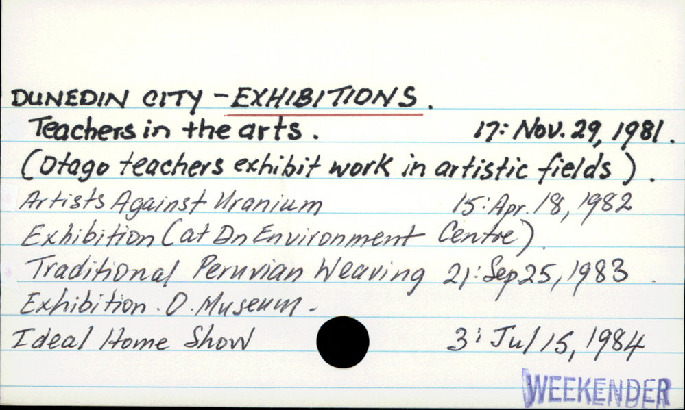 Dunedin Public Libraries (11th Dec 2016). Dunedin City - Exhibitions. In Website Dunedin Public Libraries. Retrieved 27th Mar 2026 15:08, from https://dunedin.recollect.co.nz/nodes/view/45687