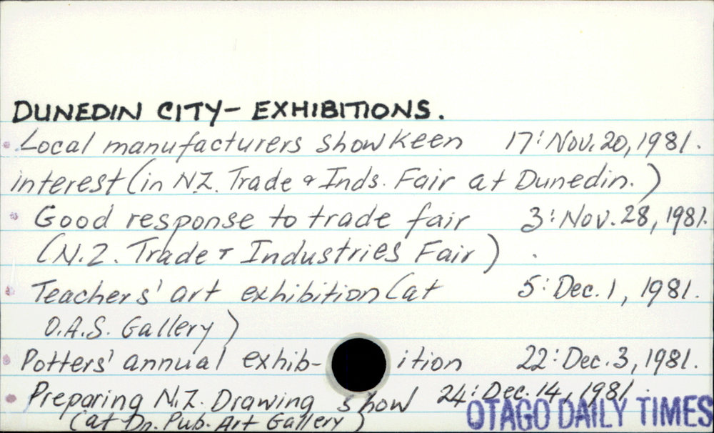 Dunedin Public Libraries (11th Dec 2016). DUNEDIN CITY - EXHIBITIONS.. In Website Dunedin Public Libraries. Retrieved 27th Mar 2026 15:11, from https://dunedin.recollect.co.nz/nodes/view/45688