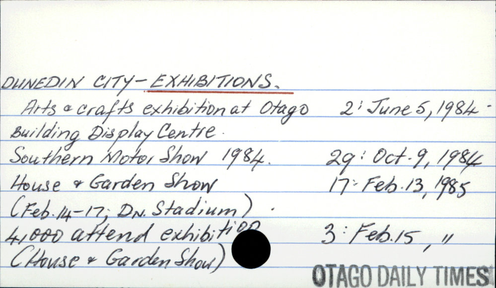 Dunedin Public Libraries (10th Dec 2016). DUNEDIN CITY - EXHIBITIONS.. In Website Dunedin Public Libraries. Retrieved 27th Mar 2026 15:05, from https://dunedin.recollect.co.nz/nodes/view/45697