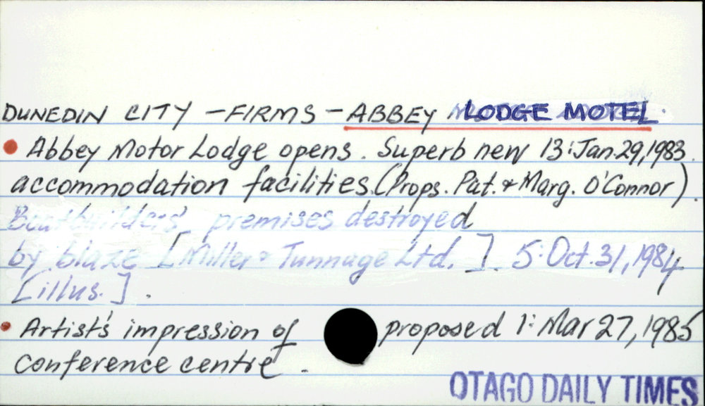 Dunedin Public Libraries (20th Dec 2016). DUNEDIN CITY - FIRMS - ABBEY LODGE MOTEL.. In Website Dunedin Public Libraries. Retrieved 3rd Apr 2026 22:58, from https://dunedin.recollect.co.nz/nodes/view/46563