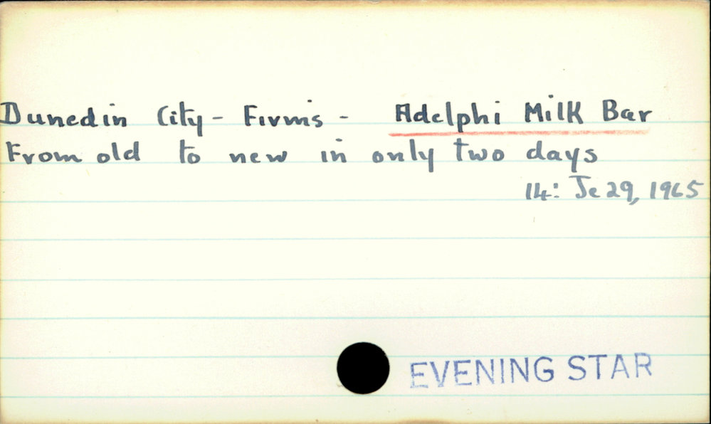 Dunedin Public Libraries (20th Dec 2016). Dunedin City - Firms - Adelphi Milk Bar. In Website Dunedin Public Libraries. Retrieved 4th Apr 2026 00:41, from https://dunedin.recollect.co.nz/nodes/view/46584