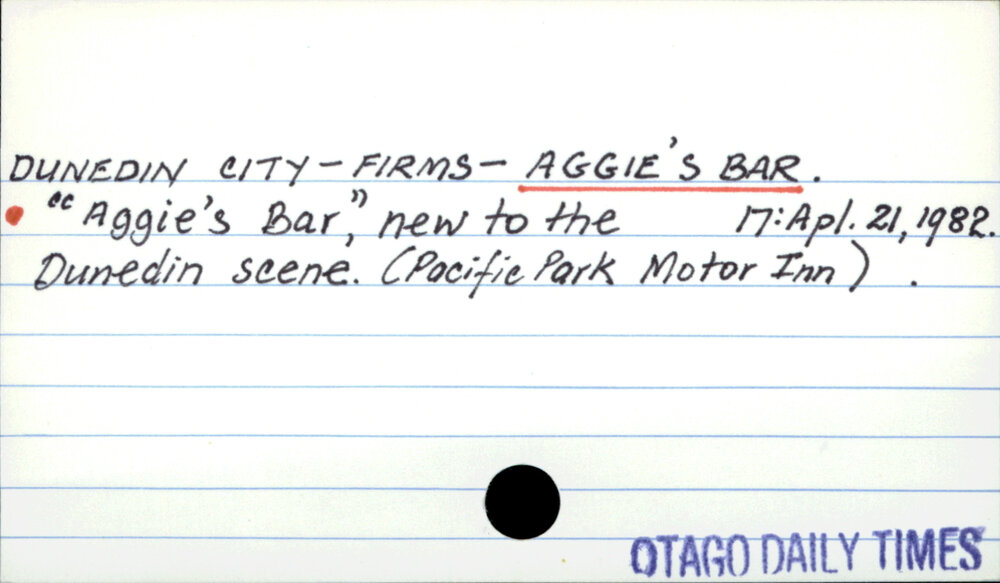 Dunedin Public Libraries (20th Dec 2016). DUNEDIN CITY - FIRMS - AGGIE'S BAR.. In Website Dunedin Public Libraries. Retrieved 4th Apr 2026 00:41, from https://dunedin.recollect.co.nz/nodes/view/46590