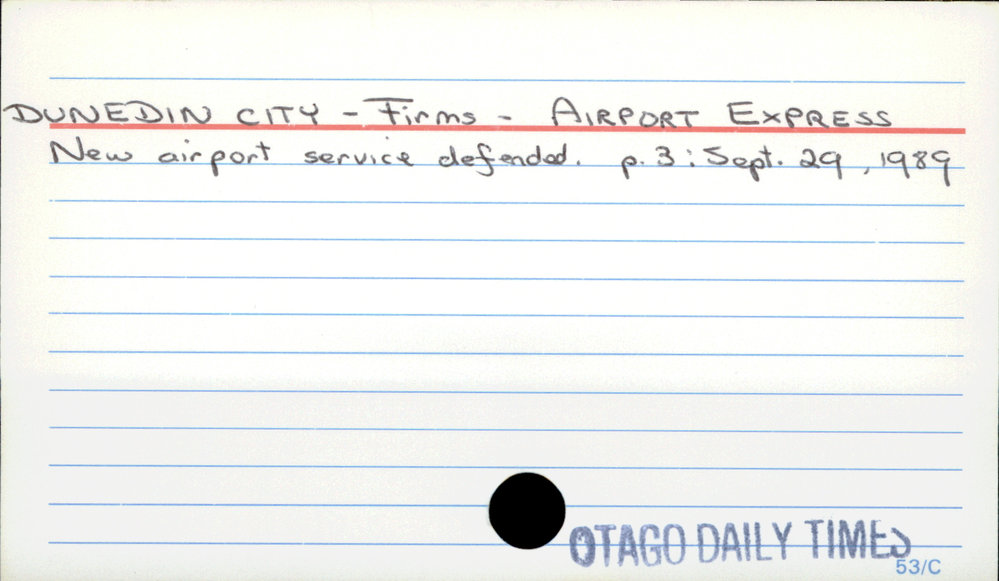 Dunedin Public Libraries (20th Dec 2016). Dunedin City - Firms - Airport Express. In Website Dunedin Public Libraries. Retrieved 4th Apr 2026 00:41, from https://dunedin.recollect.co.nz/nodes/view/46593