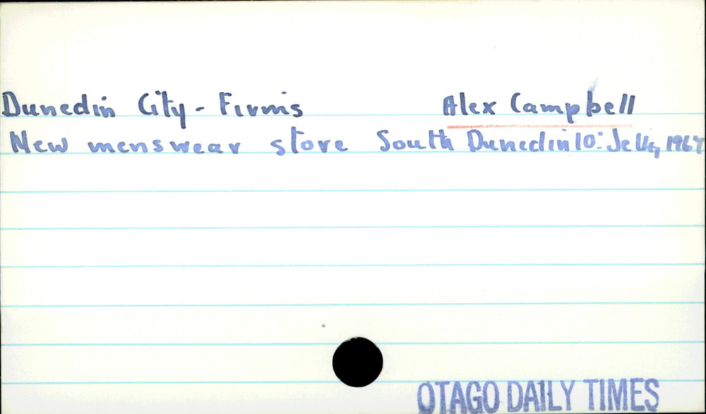 Dunedin Public Libraries (20th Dec 2016). Dunedin City - Firms - Alex Campbell. In Website Dunedin Public Libraries. Retrieved 4th Apr 2026 00:52, from https://dunedin.recollect.co.nz/nodes/view/46595