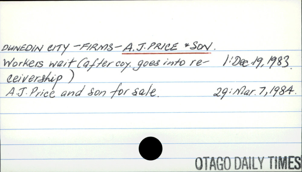 Dunedin Public Libraries (20th Dec 2016). Dunedin City - Firms - A.J. Price & Son.. In Website Dunedin Public Libraries. Retrieved 4th Apr 2026 00:52, from https://dunedin.recollect.co.nz/nodes/view/46599