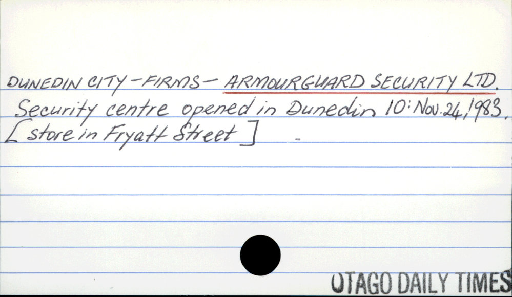 Dunedin Public Libraries (23rd Jun 2016). Dunedin City - Firms - Armourguard Security Ltd. In Website Dunedin Public Libraries. Retrieved 5th Apr 2026 19:37, from https://dunedin.recollect.co.nz/nodes/view/46659