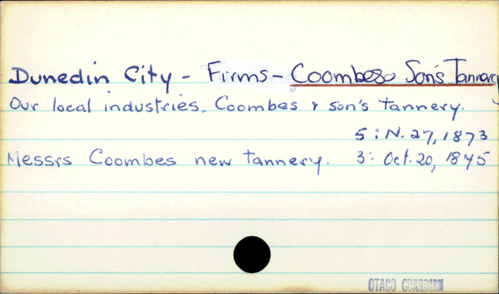 Dunedin Public Libraries (7th Jul 2016). Dunedin City - Firms - Coombes & Son's Tannery. In Website Dunedin Public Libraries. Retrieved 2nd Apr 2026 18:19, from https://dunedin.recollect.co.nz/nodes/view/47057