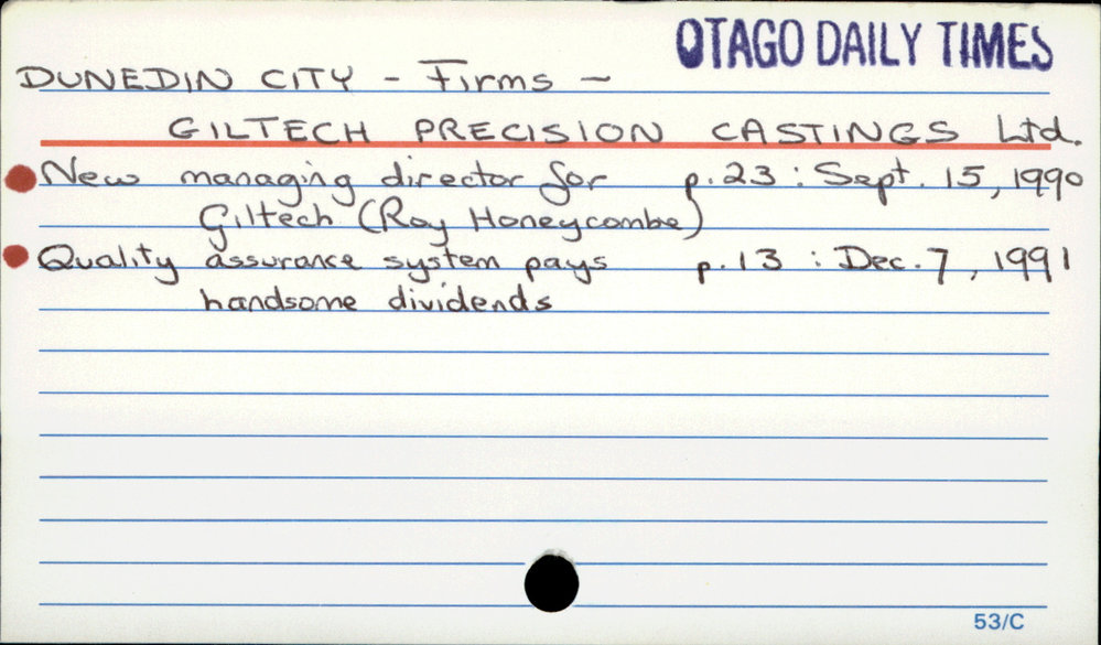 Dunedin Public Libraries (19th Jul 2016). Dunedin City - Firms - Giltech Precision Castings Ltd.. In Website Dunedin Public Libraries. Retrieved 4th Apr 2026 17:00, from https://dunedin.recollect.co.nz/nodes/view/47529
