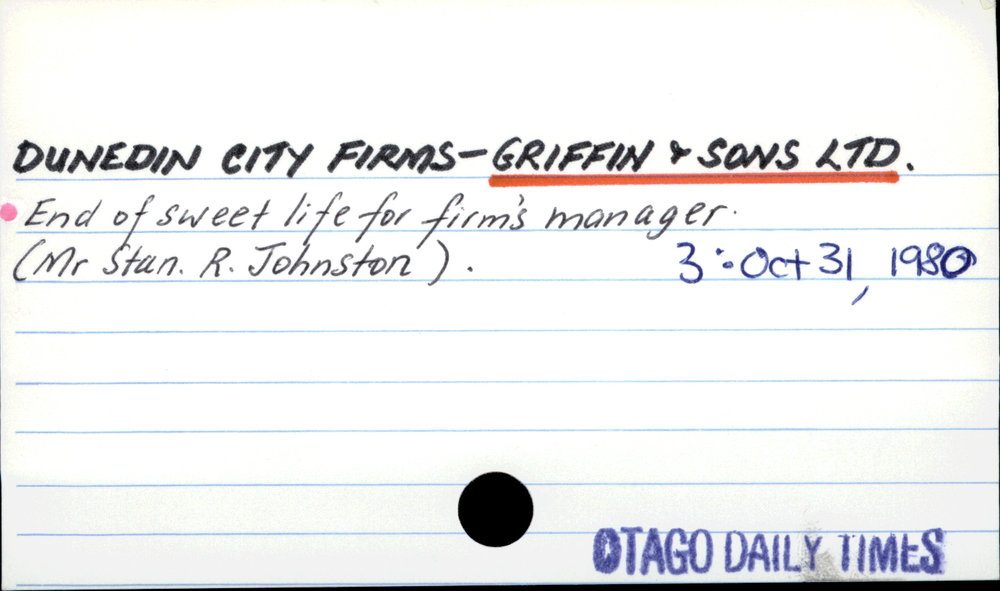 Dunedin Public Libraries (21st Jul 2016). Dunedin City - Firms - Griffin and Sons Ltd.. In Website Dunedin Public Libraries. Retrieved 2nd Apr 2026 16:41, from https://dunedin.recollect.co.nz/nodes/view/47567